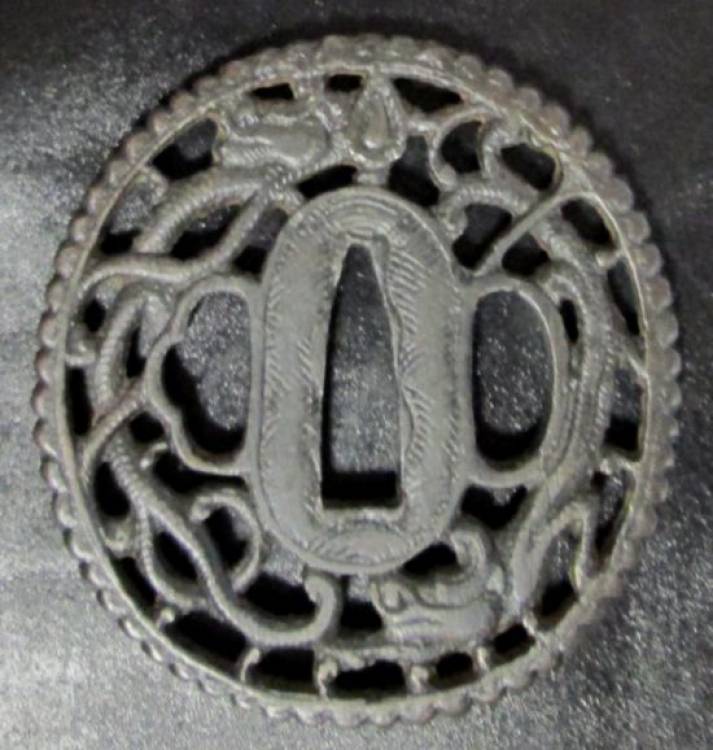 Naga-Maru-Gata (Ovale). Namban Tsuba (Modello Straniero). Draghi Avvolti. Misure: mm. 69x65.