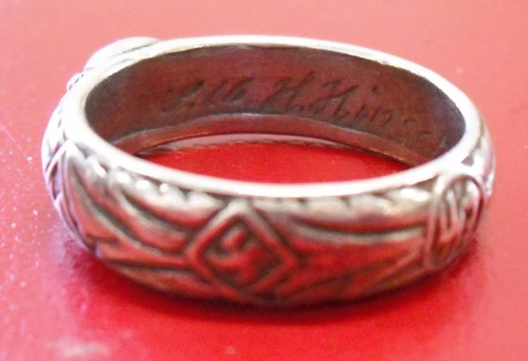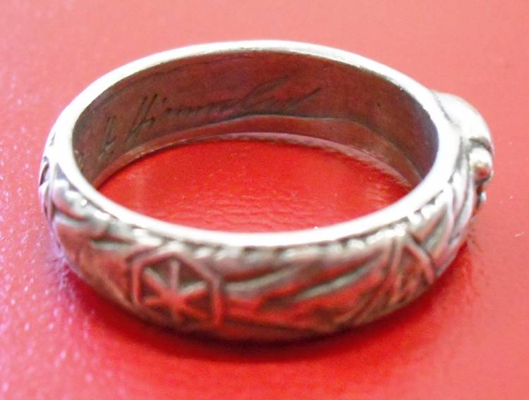 OTTIMA RIPRODUZIONE IN ARGENTO DEL NOTO ANELLO D´ONORE DELLE SS CON FIRMA AUTOGRAFA DEL REICHSFUHRER HEINRICH HIMMLER, NOME DELL´INSIGNITO E DATA DI CONSEGNA, INCISI INTERNAMENTE. MISURA GRANDE. NUOVO.
