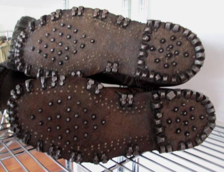SCARPONI DA ALPINO I MODELLO CON ALLACCIATURA A 4 FORI E 4 GANCETTI. MARCATI E IN CONDIZIONI MOLTO BUONE. CONSERVANO TUTTA LA CHIODATURA.