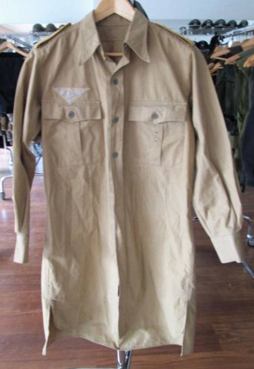 RARA CAMICIA TROPICALE DI II TIPO CON AQUILA E SPALLINE FJ TRUPPA. TUTTA APERTA SUL DAVANTI CON QUATTRO BOTTONI IN CARTONCINO PRESSATO. NON PREVEDE BOTTONI SUL COLLETTO.
