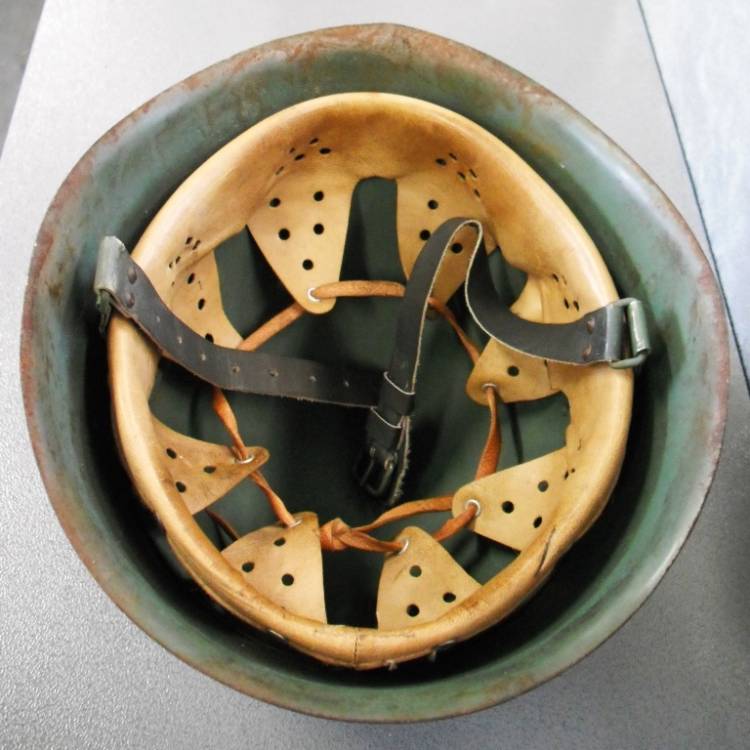 GUSCIO ORIGINALE BELLICO. VERNICE A CARATTERE MIMETCO NON ORIGINALE. FREGIO DEI BATTAGLIONI "M"- "LEGIONE TAGLIAMENTO" VERNICIATO A MASCHERINA, NON ORIGINALE. INTERNO E SOGGOLO ORIGINALI. BELLISSIMA RIPRODUZIONE DI UN ELMETTO DELLA "REPUBBLICA SOCIALE ITALIANA" INTROVABILE.
