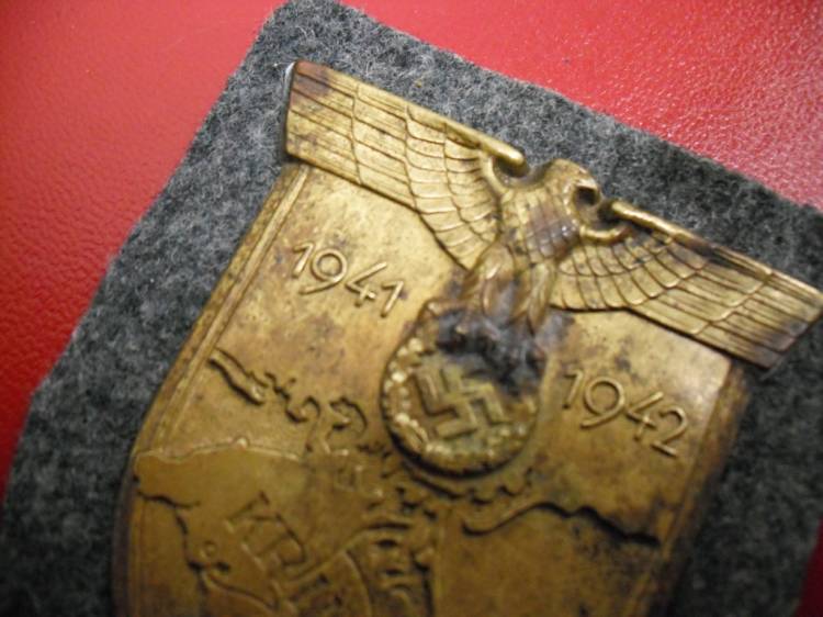 SCUDETTO DA BRACCIO CONCESSO PER LA PARTECIPAZIONE ALLA CAMPAGNA DI CRIMEA SUL FRONTE RUSSO 1941/1942; ISTITUITO IN OCCASIONE DELLA CONQUISTA DI SEBASTOPOLI (4 LUGLIO 1942). NON MAGNETICO, IN LAMINA DI OTTONE (RARO). BELLISSIMO EFFETTO BRONZO. BELLA PATINA. STOFFA FELDGRAU HEER (ESERCITO) E WAFFEN SS. IN OTTIME CONDIZIONI. ORIGINALE
