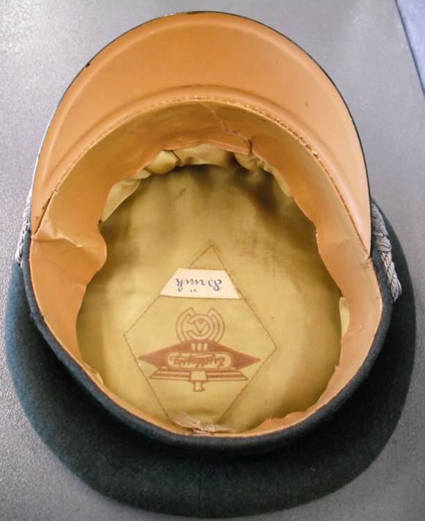 PER UFFICIALE DEL REICHSFORSTAMT (DIPARTIMENTO FORESTALE NAZIONALE). FREGI IN ALLUMINIO STAMPATO SENZA ALCUN SEGNO DI MANOMISSIONE. INTERNO CON ROMBO IN CELLULOIDE E MARCHIO DI FABBRICA; TARGHETTA NOMINATIVA DELL´UFFICIALE. ALLUDA IN CARTONE PRESSATO CON IMPERCETTIBILI SEGNI DI PORTO. BELLA FORMA E CONDIZIONI SPLENDIDE. PRATICAMENTE PARI AL NUOVO.