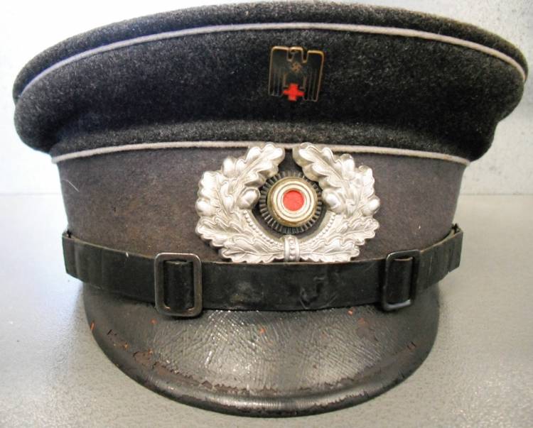 PER SOTTUFFICIALE DELLA DEUTSCHES ROTES KREUZ (CORPO DELLA CRECE ROSSA TEDESCA). AQUILA IN METALLO CON SMALTI, COCCARDA NAZIONALE CON FRONDE DI CUERCIA IN ALLUMINIO STAMPATO; BEN SALDI E SENZA VISIBILI SEGNI DI MANOMISSIONE. FASCIA ,SOVRAFASCIA E PIATTO, SENZA TRAMATURE. TESA IN VULCANFIBER CON LIEVI SCREPOLATURE. INTERNO IN COTONE CON TIBRI (NON PIU´ LEGGIBILI) E NOMINATIVO DEL SOTTUFFICIALE. ALLUDA IN TELA CERATA CON LACERAZIONI. OGGETTO RUSPANTE E ORIGINALE.