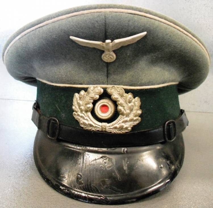 SCHIRMMUTZE PER SOTTUFFICIALE HEER (ESERCITO). WAFFENFARBEN BIANCO-FANTERIA. AQUILA IN METALLO STAMPATO MANCANTE DI UNA LINGUETTA POSTERIORE PER IL FISSAGGIO, MA POSIZIONATA CORRETTAMENTE. COCCARDA NAZIONALE CON FRONDE DI QUERCIA IN ALLUMINIO STAMPATO, BEN SALDI E NON MANOMESSI. FASCIA VERDE SCURO, SOVRAFASCIA E PIATTO IN OTTIME CONDIZIONI, SENZA LACERAZIONI O TARMATURE. INTERNO IN SETA CON DIAMANTE IN CELLULOIDE CON MARCHIO DEL PRODUTTORE. TARGHETTA NOMINATIVA DEL SOTTUFFICIALE. ALLUDA IN CUOIO LAVORATO CON SEGNI DI PORTO. ECCELLENTI CONDIZIONI GENERALI.