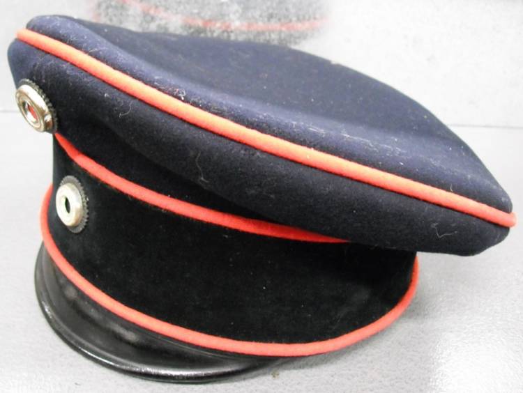 PER UFFICIALE ESERCITO PRUSSIANO. IN LANA BLU CON FASCIA NERA. WAFFENFARBE ROSSO. COCCARDA NAZIONALE TEDESCA E COCCARDA BIANCO NERA PRUSSIANA. NESSUN SEGNO DI MANOMISSIONE. INTERNO IN CARTA TELATA CON MARCHIO DEL FABBRICANTE STAMPATO E FOTO DEL KAISER INSCRITTA IN OVALE DORATO. ALLUDA IN CUOIO CON SEGNI DI PORTO. CONDIZIONI OTTIME.