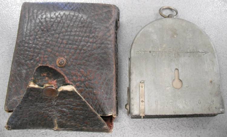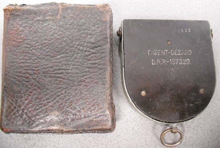 PRESENTA ISCRIZIONI "PATENT-BEZARD" "D.R.P.-157329"(Deutsches Reichs Patent e numero del brevetto), NUMERO DI MATRICOLA E MARCHIO "GL"(Georg LUFFT), SULLA CASSA IN BACHELITE. FRECCIA SU SCRITTA(in Tedesco) "DIREKTION" SUL COPERCHIO IN ALLUMINIO.