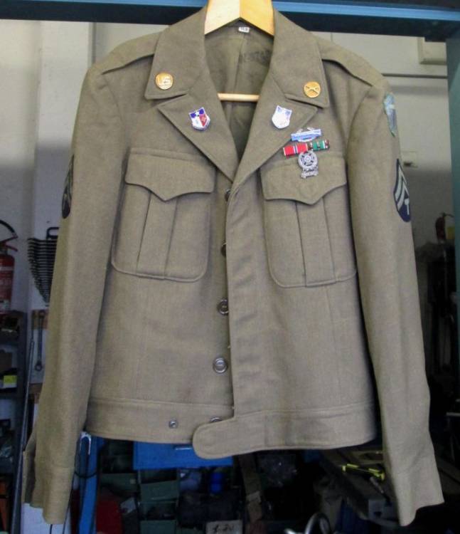 SPLENDIDA IKE JACKET MOD.43 in Lana Mutard da ´Technician 4th Grade´ del 141° Rgt. della 36^ Divisione Texas (annientato sul fiume Rapido - Frosinone nel 1944), con varie decorazioni, tra cui il ´Combat Infantry Badge´ ed il ´Bronze Star Ribbon´. Condizioni eccellenti. Trovata insieme alla Camicia (2051) ed ai Pantaloni (2052).