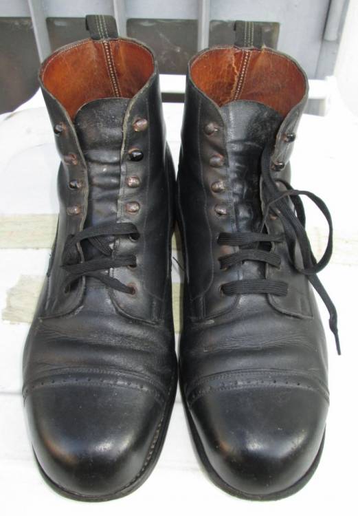 RARI SCARPONCINI DI SERVIZIO PER TRUPPA E UFFICIALI. USATI IN PARTICOLARE DAI SOMMERGIBILISTA. IN CUOIO NERO, HANNO IL TACCO IN CUOIO MARRONE ANTISCIVOLO. ALLACCIATURA A 3 FORI E 4 GANCI. CONDIZIONI MOLTO BUONE.