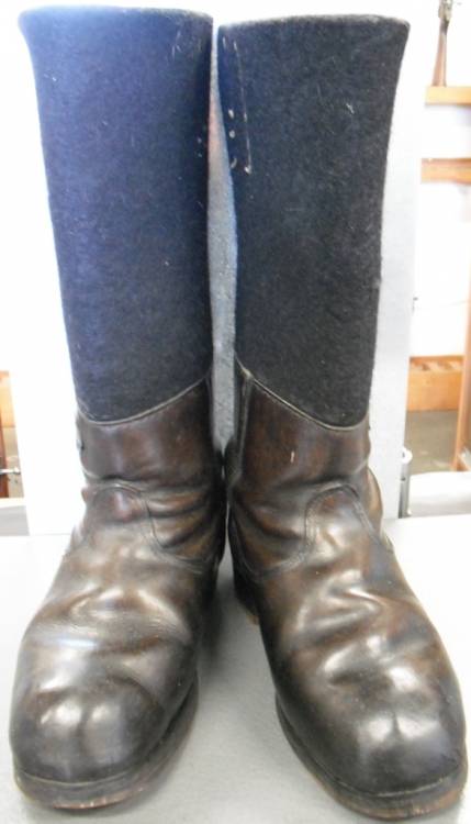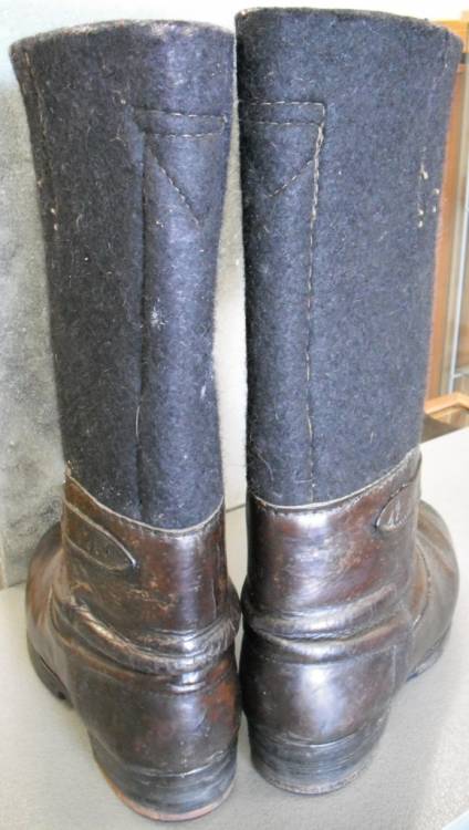 IN FELTRO NERO E CUOIO MARRONE. NUMERO GRANDE, ORIENTATIVAMENTE 44/45. PORTATI MA IN SPLENDIDO STATO DI CONSERVAZIONE. RINFORZO LATERALE IN CUOIO CON SIGLA E NUMERI. RARI.