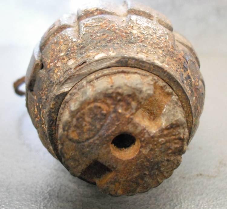 BOMBA A MANO INGLESE TIPO MILLS n°36 Mod. MKI. COMPLETA. BUONE CONDIZIONI. MARCHI E SIGLA ANCORA VISIBILI SUL FONDO DEL CORPO DELLA GRANATA.
