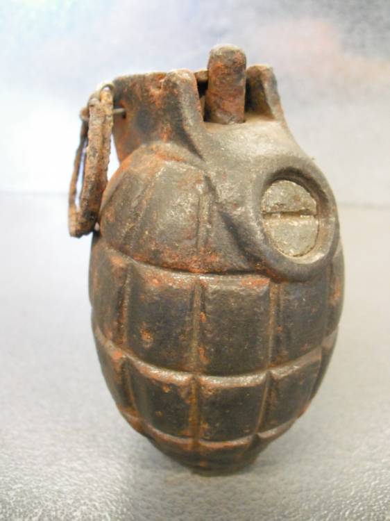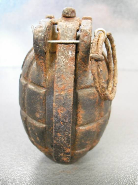 BOMBA A MANO INGLESE TIPO MILLS n°24 MKII. COMPLETA. BUONE CONDIZIONI. MARCHI E SIGLA ANCORA VISIBILI SUL FONDO DEL CORPO DELLA GRANATA.