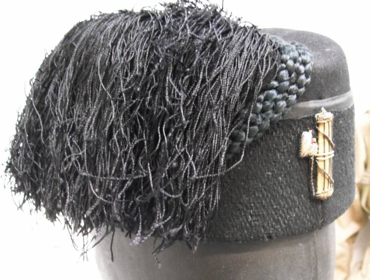 FEZ DA FIDUCIARIO DI GRUPPO RIONALE DEL PARTITO NAZIONALE FASCISTA. IN FELTRO PETTINATO CON FASCIO LITTORIO RICAMATO IN CANOTTIGLIA DORATA SULLA PARTE FRONTALE; DISTINTIVO INDICATIVO DI GRADO RICAMATO IN CANOTTIGLIA DORATA SU FONDO ROSSO CON STELLA METALLICA DORATA. FODERATO ALL´INTERNO IN SETA BIANCA CON LOGO DI FABBRICA E ISCRIZIONE "EXTRA FINE". Tg. 58. ALLUDA IN CUOIO MARRONE TESTA DI MORO. BUONE CONDIZIONI.