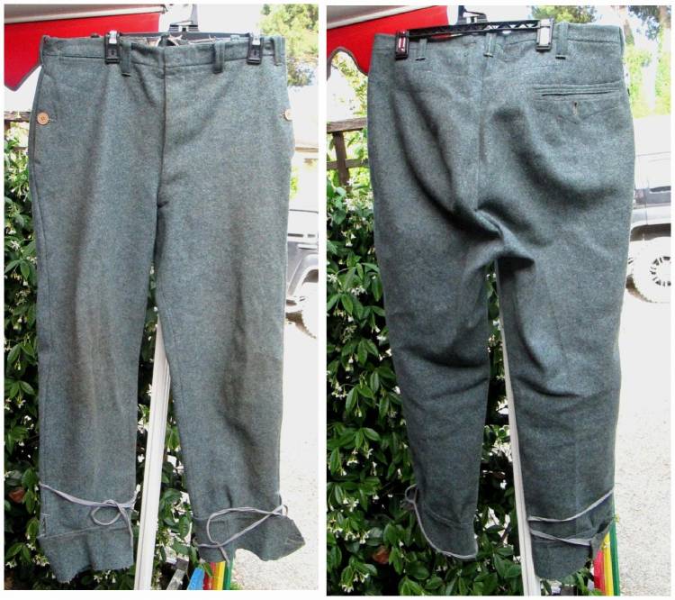 PANTALONI M.44 DA COMBATTIMENTO PER TRUPPA/UFF. DELLA R.S.I. IN LANA VERDE. COMPLETI DI GHETTE, CUCITE SUL CAMPO DIRETTAMENTE SUI PANTALONI. FODERA GRIGIA REGOLAMENTARE. TAGLIA GRANDE.