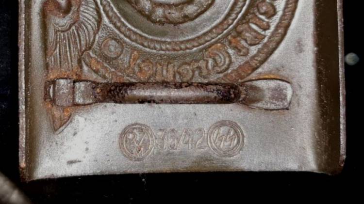 FIBBIA IN ACCIAIO, MARCATA ´SS 36/42 RZM´ (Overhoff-u. Co., Lüdenscheid, Nordrhein-Westphalen) CON VERNICIATURA VERDE.