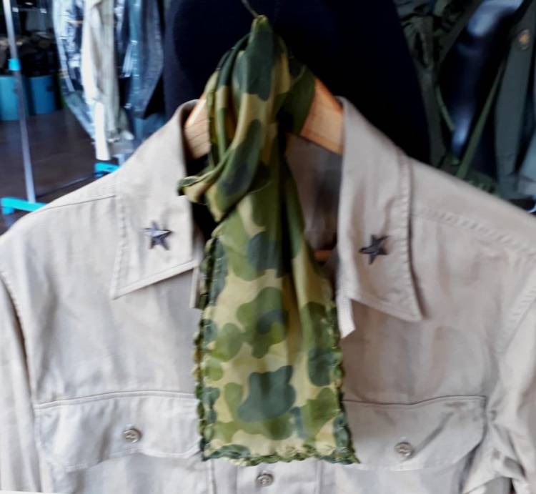 CAMICIA REGOLAMENTARE ESTIVA IN COTONE DA BRIGADIERE GENERALE DEI PARACADUTISTI. STELLETTE REGOLAMENTARI II GM. TROVATA CON FOULARD, GIACCA, PANTALONI, BERRETTO, STIVALETTI. ETC. CONDIZIONI OTTIME.