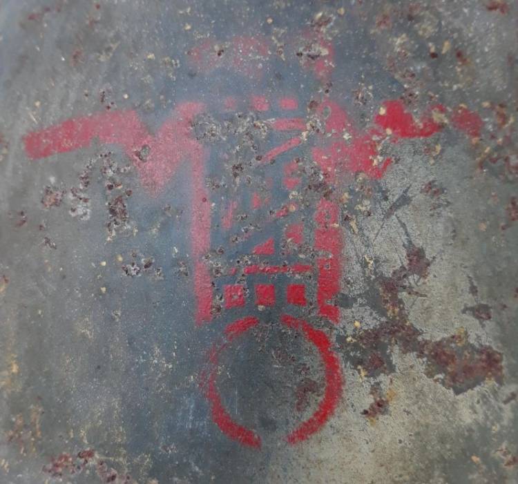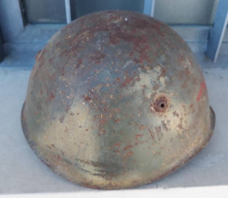 RARO ELMETTO DELLA GNR MOD.33 MIMETICO CON FREGIO ROSSO A VERNICE. RACCOLTO DA CONTADINI NELLE ZONE DI COMBATTIMENTO ANTIPARTIGIANI IN VAL DI SUSA. MAI RIPULITO NE´ RESTAURATO.