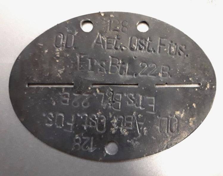 PIASTRINA DI RICONOSCIMENTO ALL. ‘128 O.D. ABt. Ost. Füs Ers, Btl. 22B’.
