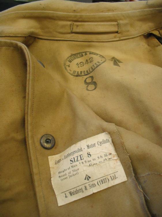 IN TELA GOMMATA PESANTE COLOR CACHI PER MOTOCICLISTA BRITANNICO. POSSIBILITA´ DI ESSERE RIPIEGATO E FISSATO FACENDO PASSARE LE ESTREMITA´ SOTTO AL CAVALLO, MEDIANTE I BOTTONI AUTOMATICI ED IL CINGHIAGGIO INTERNO, PER MAGGIOR COMODITA´ NELLA GUIDA DELLA MOTOCICLETTA. COMPLETO DI TUTTE LE CINGHIE, FIBBIE, BOTTONI E BOTTONI AUTOMATICI TUTTI FUNZIONANTI E MARCATI. TIMBRO OVALE "J.WEINBERG&SONS-MANCHESTER-1942" E TARGHETTA IN CARTA DELLO STESSO FABBRICANTE CON INDICAZIONE IN LINGUA INGLESE "COAT RUBBERPROOFED-MOTOR CYCLISTS"(GIACCONE IMPERMEABILE MOTOCICLISTI). TAGLIA "8"(INDICATA ANCH´ESSA DAL TIMBRO E SULLA TARGHETTA). ORIGINALE BELLICO. CONDIZIONI ECCELLENTI.