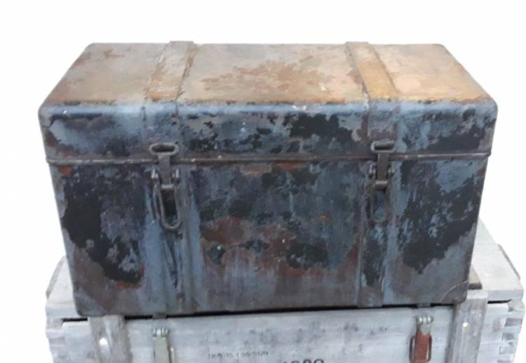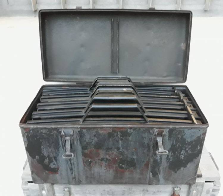 CASSETTA IN FERRO CON COLORAZIONE VERDE POI IMPIEGATA DALLA KM CON COLORAZIONE GRIGIO CHIARO. CONDIZIONI BUONE. COMPLETA DEI SUOI 5 SERBATOI IN CONDIZIONI ECCELLENTI.