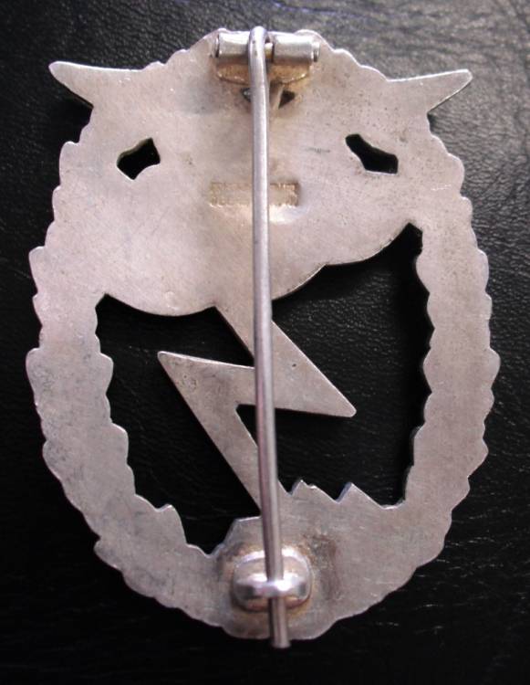 DISTINTIVO PER ASSALTI A TERRA DELLA LUFTWAFFE. PER FALLSCHIRMJAGER E FELD-DIVISION. IN TOMBAK, IN DUE PEZZI, NON RIVETTATO. AQUILA E CORONA ARGENTATE, NUVOLA E FOLGORE BRUNITE. MARCATO "FRIEDRICH KELLER-OBERSTEIN"