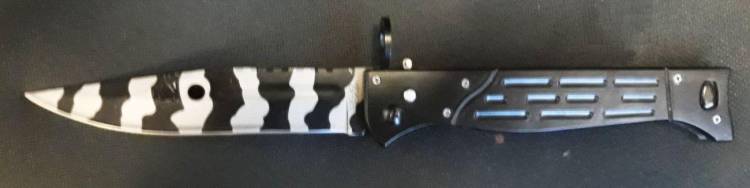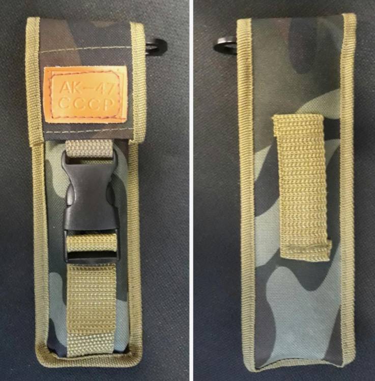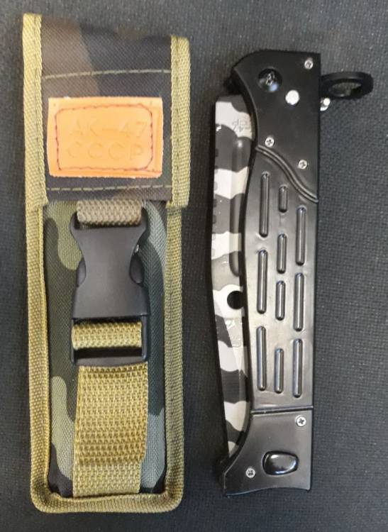 BELLA BAIONETTA/PUGNALE PIEGHEVOLE MIMETICA A SCATTO PER AK.47 MODELLO LUNGO (34 cm.). SACCA IN CORDURA MIMETICA PER IL TRASPORTO. LAMA MARCATA ´AK.47 CCCP´.