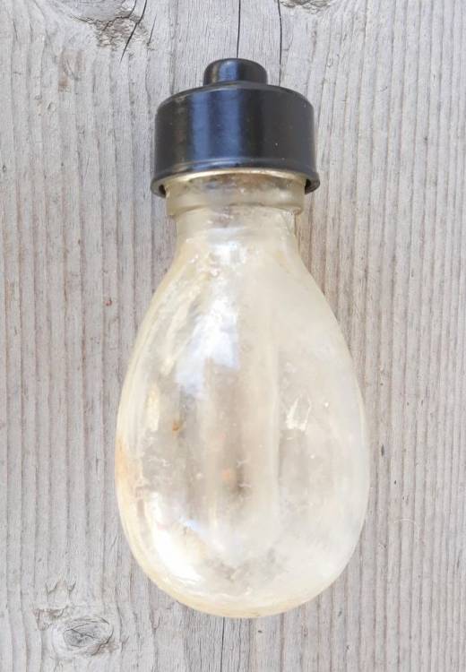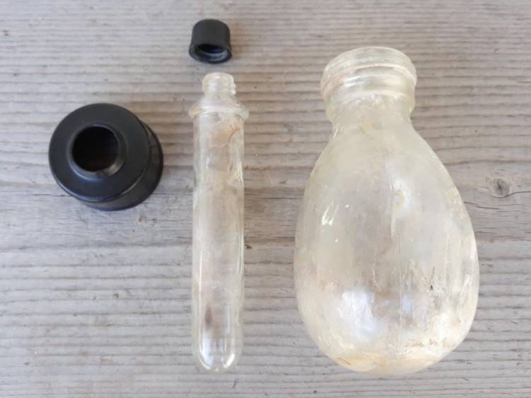 RARA BOMBA FUMOGENA TEDESCA DI VETRO DELLA SECONDA GUERRA MONDIALE. COMPLETA DELLA PROVETTA INTERNA PER IL SECONDO COMPONENTE CHIMICO.
