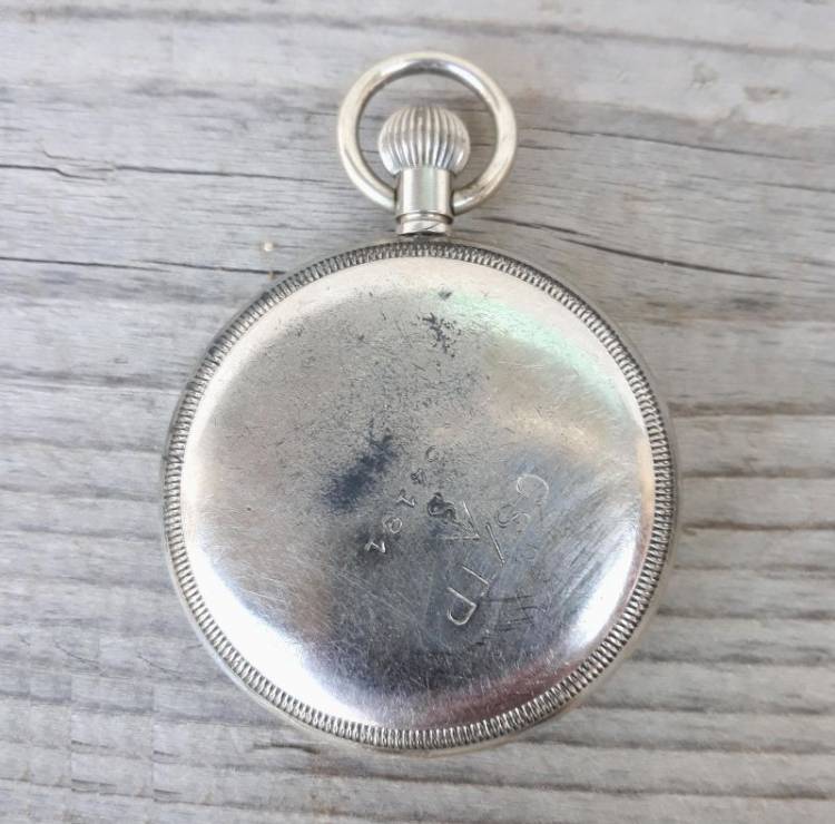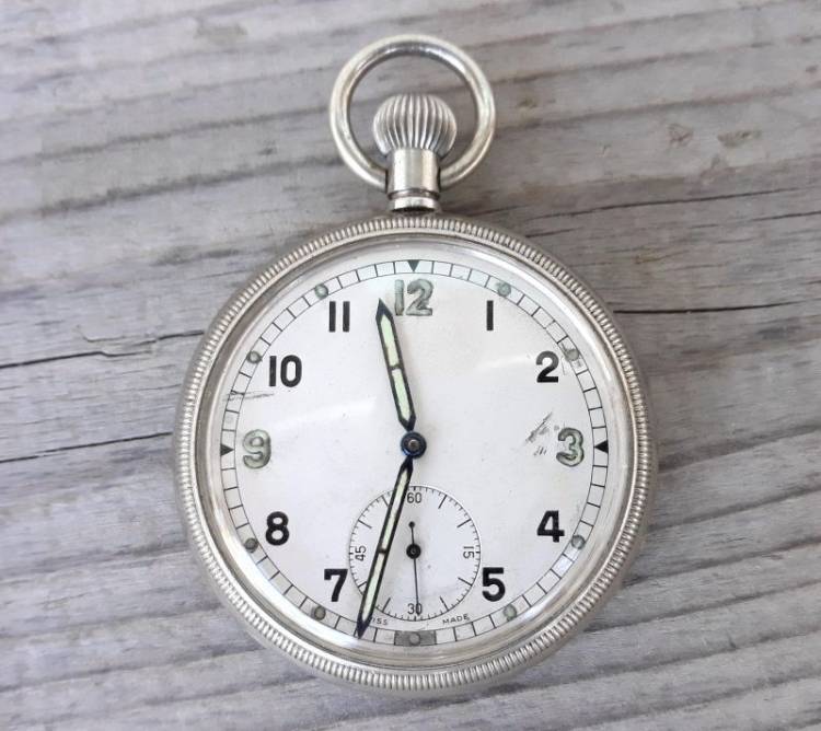 Orologio Militare da tasca Inglese GS/TP della II GM. In dotazione alle truppe inglesi. A partire dal 1939 e per tutta la durata della Seconda Guerra Mondiale, il Ministero della Difesa britannico acquistò consistenti partite di orologi da tasca da diversi fornitori svizzeri. Sono i famosi GS/TP o G.S.T.P. (General Service Timepiece/Temporary Pattern) che furono assegnati alle forze di terra mediante iscrizione della matricola sul libro paga del militare destinatario