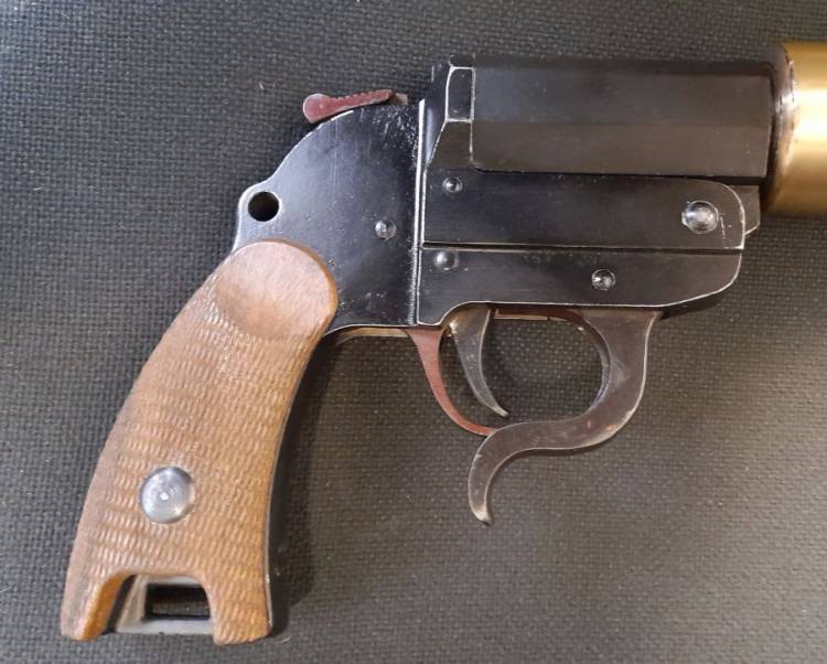 RARISSIMA PISTOLA LANCIASAGOLEDELLA KM IN DOTAZIONE ALL´U-BOAT 505 COME PUNZONATO NELL´AFFUSTO. AQUILETTA CHE SOVRASTA UNA ´M´, PUNZONE RISERVATO ALLA KRIEGSMARINE. LUNGA CANNA IN OTTONE CONTRO L´OSSIDAZIONE DA SALE. VECCHIA DISATTIVAZIONE, BASCULA E SCATTA. CONDIZIONI PERFETTE.