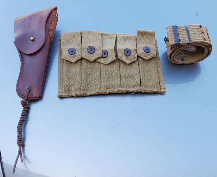 BEL CONVOLUT DI EQUIPAGGIAMENTO AMERICANO DELLA II GM. FONDINA, CINTURONE, PORTACARICATORI PER THOMPSON M.1. MATERIALE NON ASSEMBLATO, PROVIENE DALLO STESSO RINVENIMENTO.