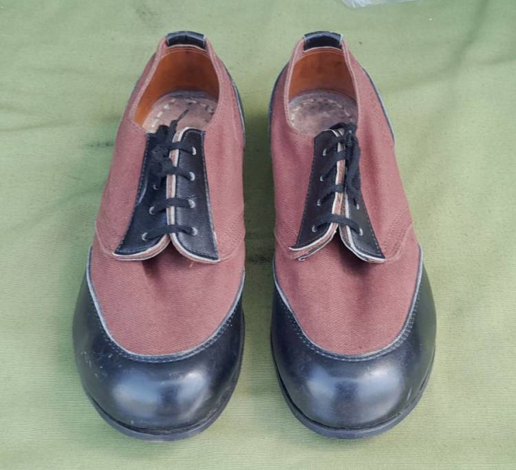 SPLENDIDE E RARE SCARPE DA PONTE PER LA TRUPPA DELLA KM TEDESCA DELLA II GM. COSTRUITE IN STOFFA MARRONE E PELLE NERA. CONDIZIONI PARI AL NUOVO.