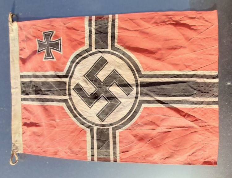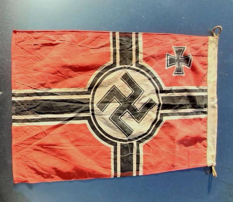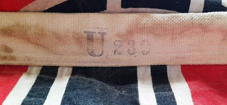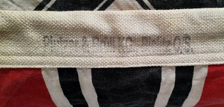 RARISSIMA BANDIERA PER SOMMERGIBILE TEDESCO DELLA II GM. MISURA cm. 75x50 E RIPORTA STAMPATO IL NOME DEL FABBRICANTE, LA ZONA DI OPERATIVITA´, IL MARCHIO DELLA KRIEGSMARINE E L´U-BOOT AL QUALE APPRTENEVA, L´ U 230. COTONE IMPERMEBILIZZATO