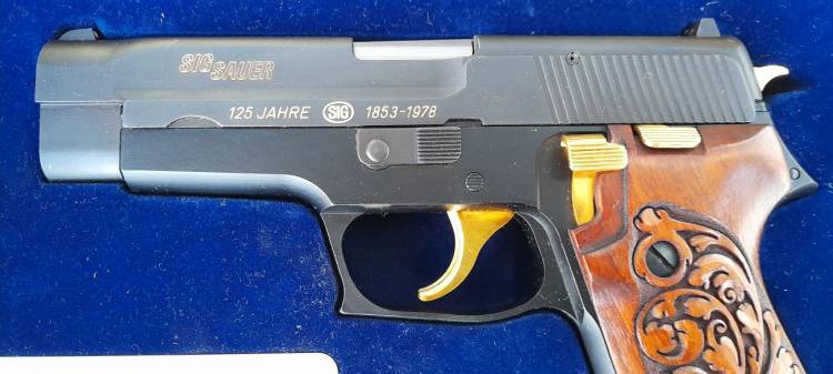 BELLISSIMA PISTOLA COMMEMORATIVA DELLA SIG SAUER MOD. P.220 FABBRICATA NEL 1978 IN OCCASIONE DEL 125° ANNIVERSARIO DALLA FONDAZIONE DELLA SIG (1853). CAL. 7,65 PB. RIPORTI IN ORO E GUANCETTE IN LEGNO SCOLPITE. IN CASSETTA.
