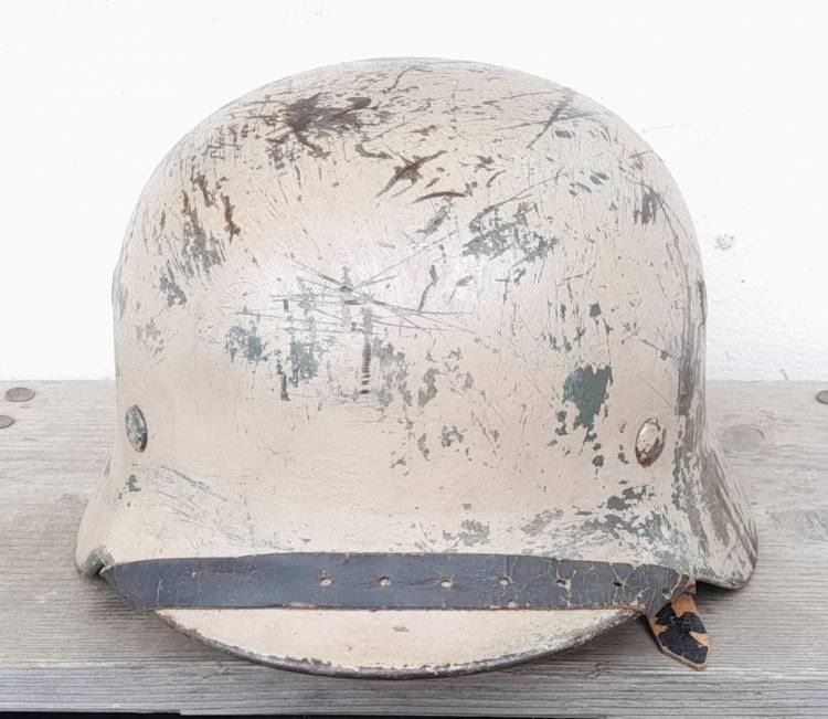 RARO ELMETTO M.40 CON VERNICIATURA BIANCO CREMA, ADATTO PER TEATRI CONTINENTALI ED INVERNALI. COMPLETO DI INTERNO CON INUSUALE MODFICA DI TAGLIA DA 57 A 56 TRAMITE SPESSORI IN SUGHERO E SOGGOLO. CONDIZIONI MOLTO BUONE.