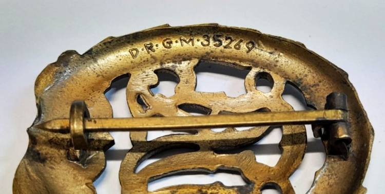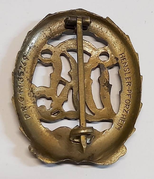 ´Deutsches Reichssportabzeichen in Bronze ´DRL´ mit Hakenkreuz´. Veniva concesso dalla Associazione per l´Educazione Fisica del III Reich (´Deutscher Reichbund fur Leibesubungen´). Marcato: ´HENSLER PFORZHEIM - D.R.G.M. 35269´.