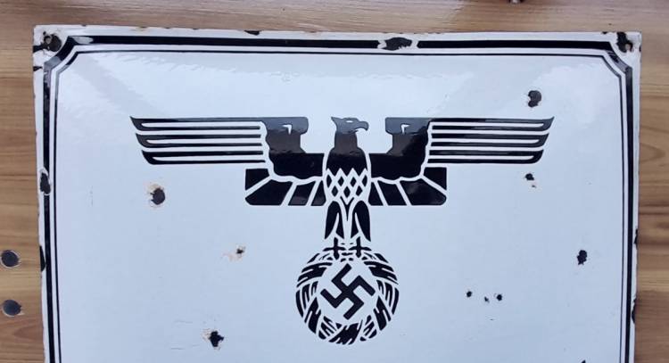 SPLENDIDA TARGA da Edificio in Ferro smaltato bianco a Scritte nere del Comando delle SA di Northeim: ‘SA der NSDAP Standarte 136’. MISURE: cm. 50x50