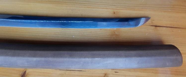 La lama ha un vivido Hamon in stile Gunome (ondulato regolare) e un grande Horimono che attraversa quasi tutta la spada. Raffigura un albero di pompelmo, che simboleggia la bellezza e l´effimero della vita, concetti molto apprezzati dai samurai. Lo Shirasaya protegge la lama meglio del Koshirae dall´umidità e dai danni grazie al suo legno speciale. Era usato dai samurai mentre non erano in combattimento. La lama, polita professionalmente, è in buonissime condizioni, senza scalfitture e Hagire.