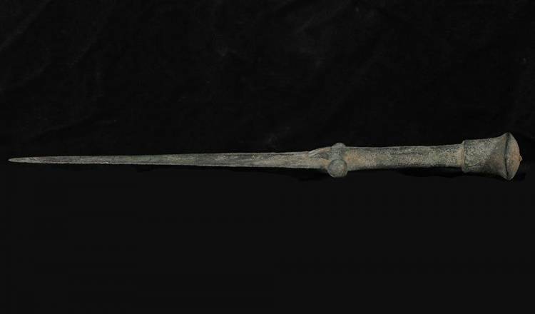 Lama triangolare con nervatura centrale. Impugnatura a sezione quadrata con pomolo a forma di cuneo e guardia orizzontale con terminali arrotondati e due sporgenze appuntite verso il centro della lama. Bella patina verde. La lama presenta alcune scheggiature sui bordi.