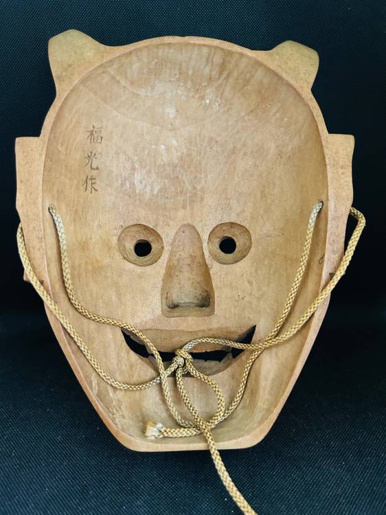 Maschera Noh scolpita in legno di alta qualità. Autore 福光, firmata nel retro.