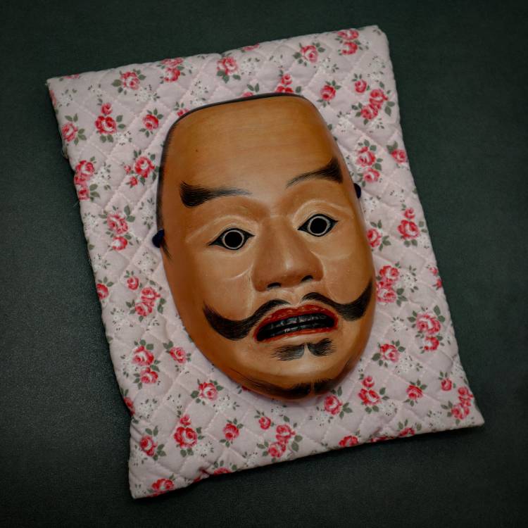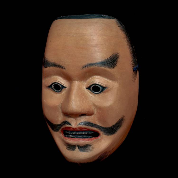 Maschera Noh scolpita in legno di alta qualità usata per i ruoli del guerriero-fantasma Egarano Heita Kanenaga, coraggioso guerriero del periodo Kamakura. Appare nell´opera teatrale Ebira (La faretra). Dimensioni: 21 x 14 x 8 cm.