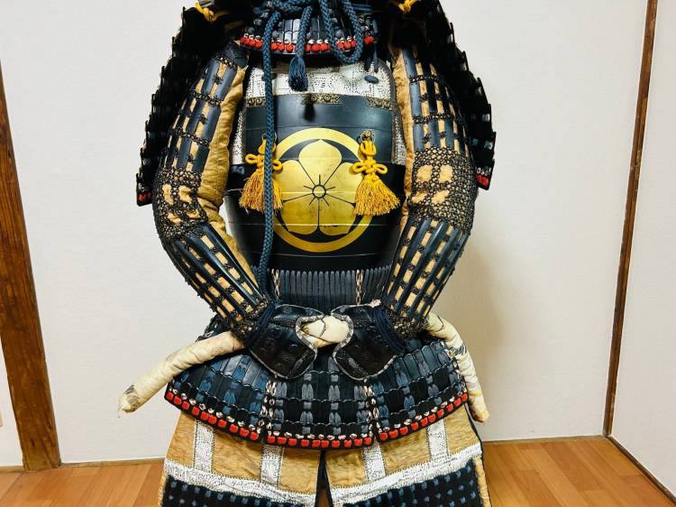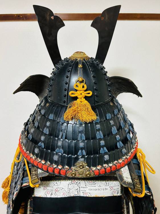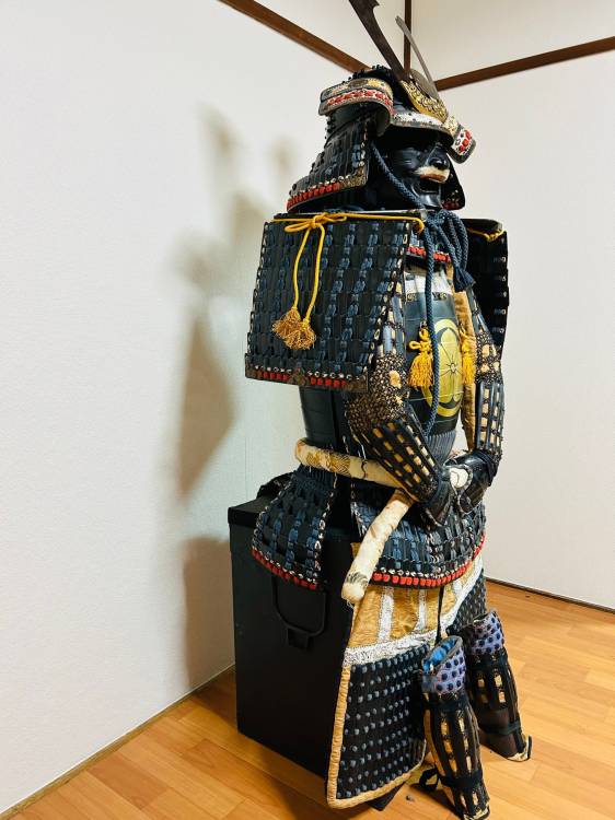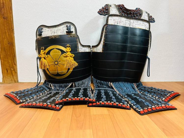Armatura giapponese laccata nera Yoroi. Corazza a due pezzi (kuro´urushinuri kon´ito hi´suso nimaidô tôsei gusoku) con stemma di famiglia.