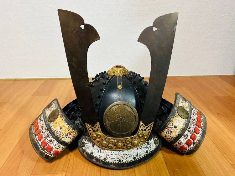 - Suji´bachi Kabuto a 8 piastre in "ferro ruggine" (elmo con creste rialzate) con 12 file di rivetti a cupola. Stemma di famiglia in rame maedate, fiancheggiato da kuwagata a forma di corno.