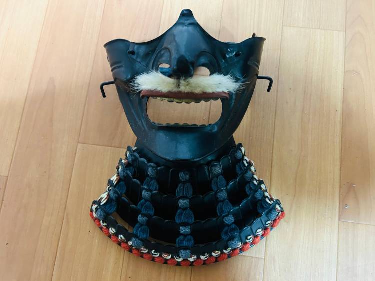 - Menpo Maschera facciale raffigurante l´"uomo arrabbiato" resseibô con denti laccati d´oro e gorgiera a quattro livelli con piastre "itazane" (yodarekake).
