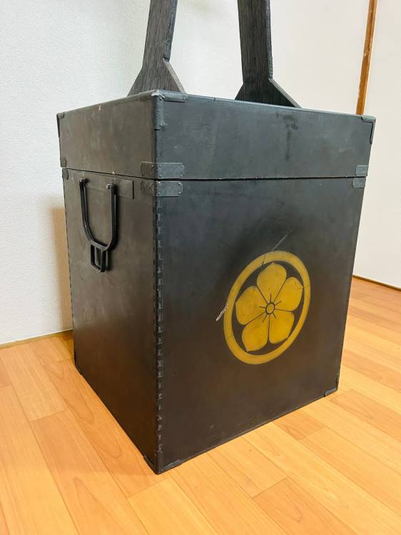 Cassa di immagazzinaggio per l´armatura (yoroi´bako) dotata di maniglie per il trasporto con pali e rinforzata da ferramenta in metallo. Il lato anteriore è decorato con lo stemma