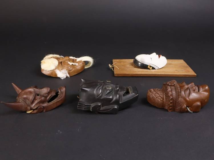 Piccola Maschera Ko-omote in ceramica montata su una targa in legno, firmata e sigillata dall´artista. Dimensioni della targa: H. 22,4 cm La. 11,7 cm Pr. 5,5 cm.