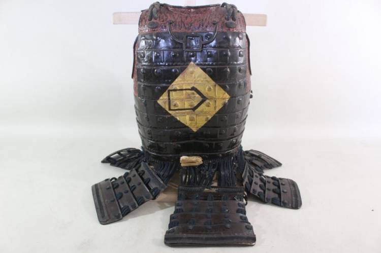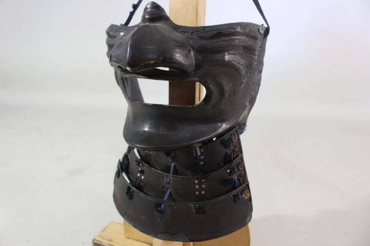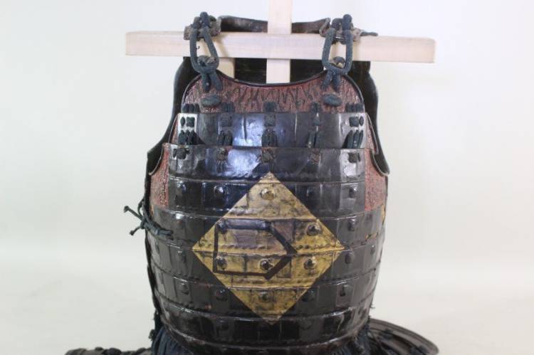 Mendare: laccato nero rivestito in ferro. Yokohagi Dou Gusoku: 2 piastre in ferro laccato nero con Mon di famiglia Oro.
