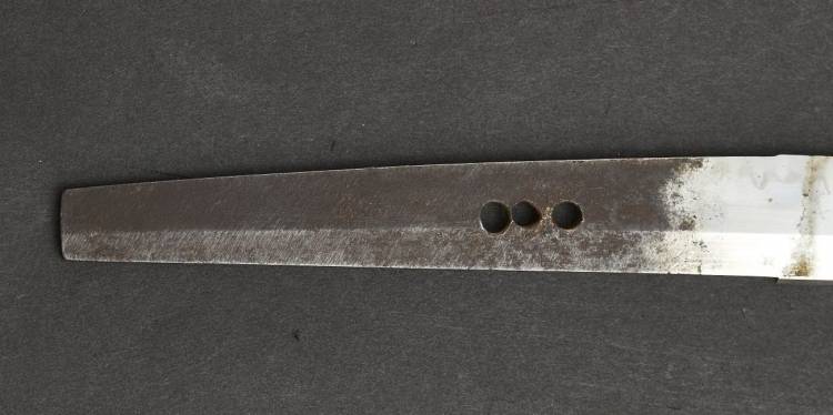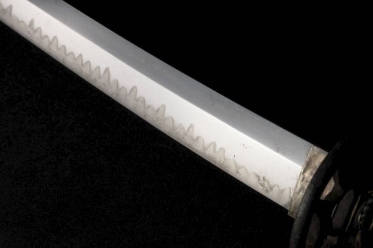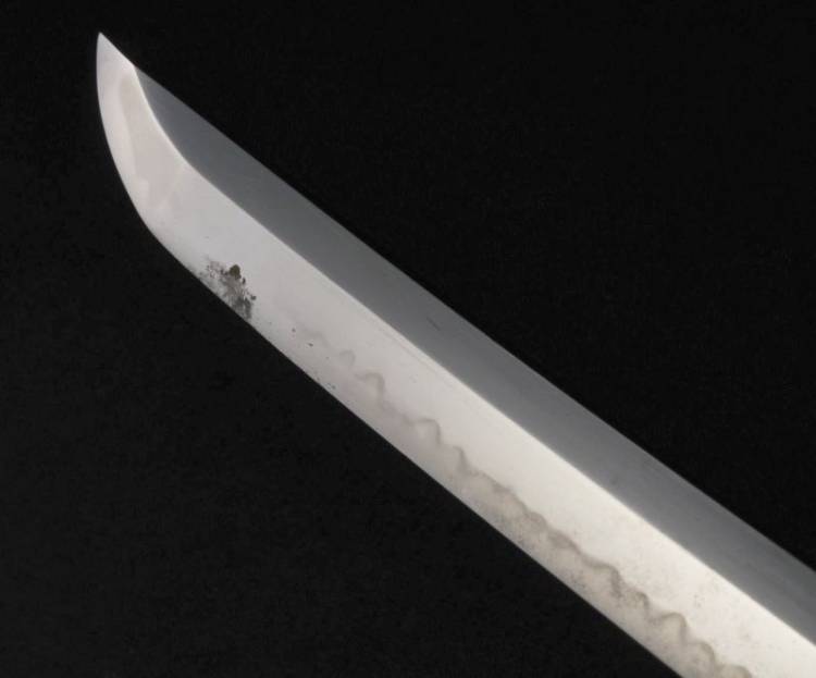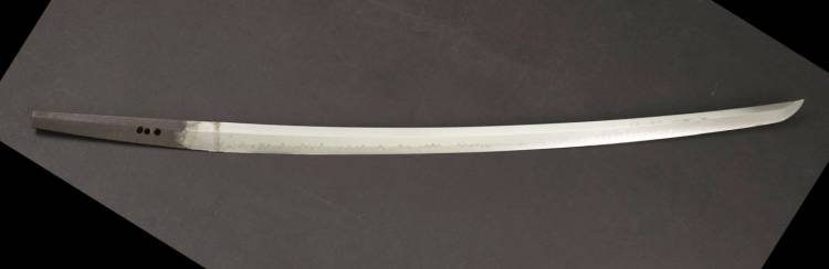 dinamicità alla sua fattura. Certificato di registrazione delle armi da fuoco e delle spade (rilasciato dalla Prefettura di Chiba – N. 054624 del 2 Febbraio 2019) in copia, poiché il documento originale deve essere restituito alle autorità. Il certificato elenca la lunghezza della lama (59,4 cm), al limite della misura della Katana, 2 Shaku, la curvatura, Sori, (1,5 cm). Lunghezza totale della lama: 75 cm. Lunghezza totale: 93 cm.