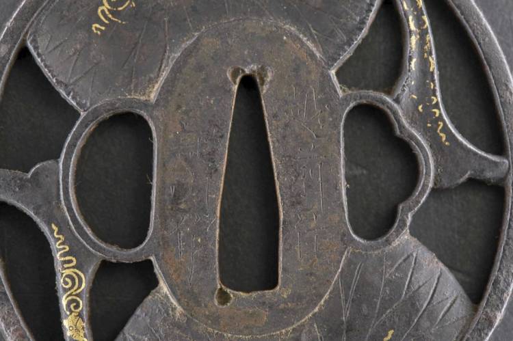 La Sukashi Tsuba è realizzata in ferro, con un intricato disegno dello stemma Aoi traforato con intarsi in ottone. La tsuba è firmata Echizen Jū Kinai, rinomati artigiani Kinai del periodo Edo. La stirpe Kinai è una delle più celebri scuole di artigiani di tsuba, originaria del tardo periodo Muromachi e continuata per sette generazioni sotto la famiglia Takahashi fino all´era Meiji. Vasta documentazione sulle tsuba Echizen Kinai nell’opera "Echizen Kinai Tsuba" di Nobuo e Nobuei Tsuruoka. Il Fuchi è decorato con un intarsio in ottone di corde shimenawa in altorilievo, che simboleggiano la purificazione e la protezione nella tradizione giapponese.