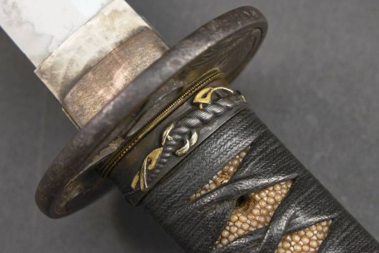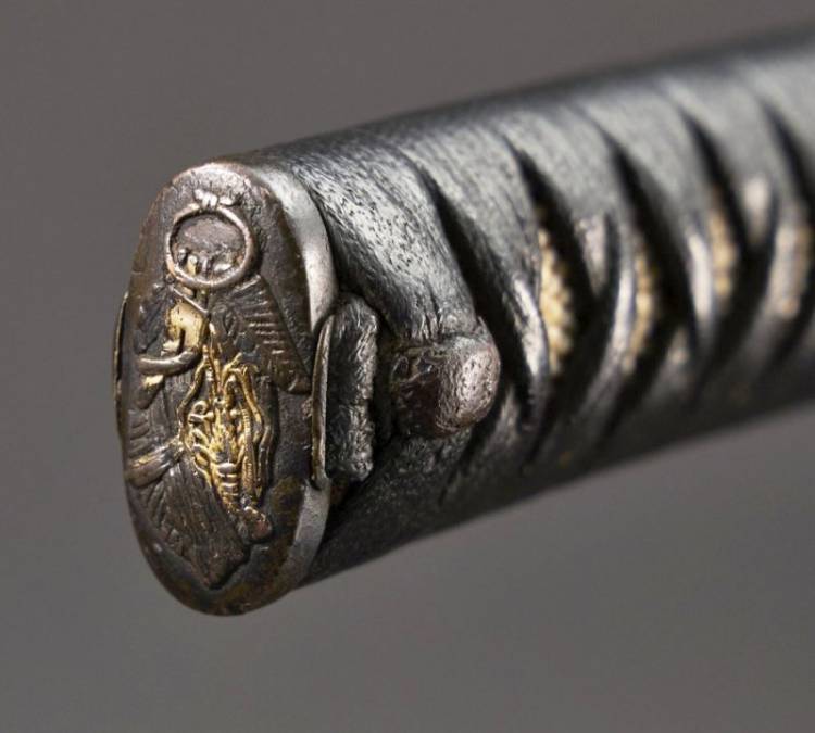 Il Kashira presenta un design in ottone intarsiato con foglie e un´aragosta spinosa, un motivo associato alla longevità e alla resistenza. I Menuki sono una coppia di anatre mandarine intarsiate in ottone, che rappresentano amore, fedeltà e armonia, poiché sono spesso raffigurate come coppie inseparabili. La lama ha uno straordinario Hamon (linea di tempra) che aggiunge