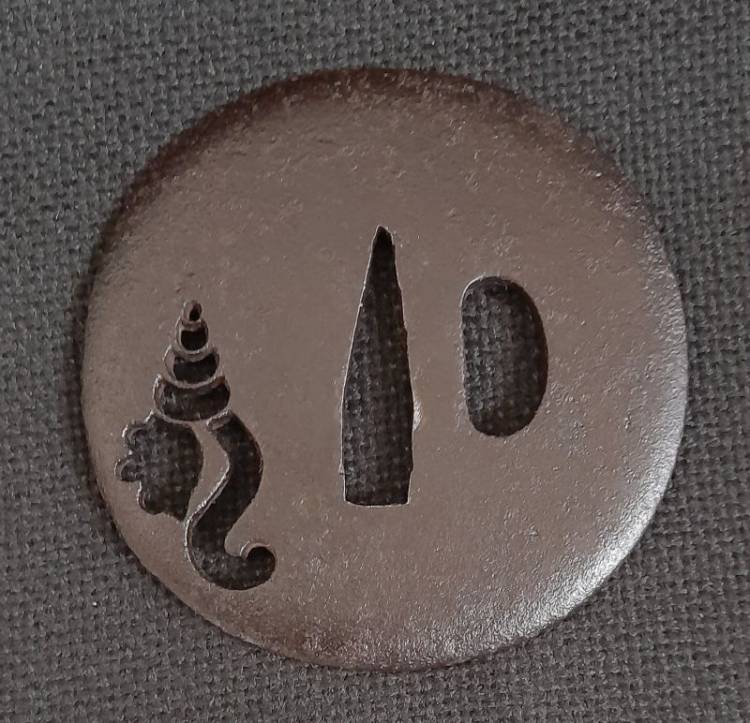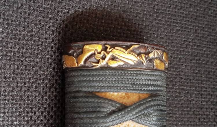 Sukashi Tsuba firmata. Fuchi, Kashira e Menuki sono decorati con intarsi in ottone/oro floreali e zoomorfi.